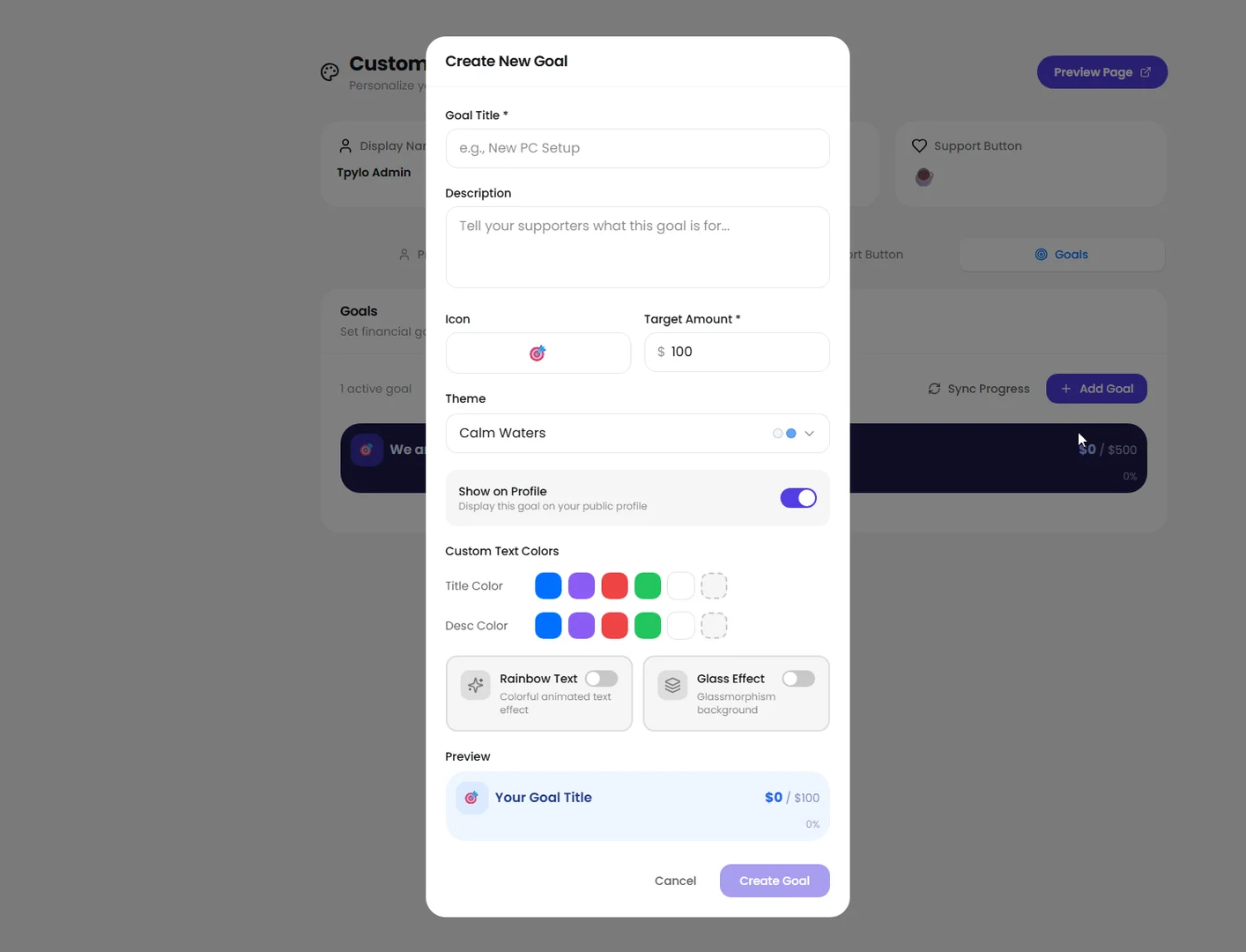 Creator Goals is a visual progress tracker that lives right on your Tpylo profile. Think of it as a public fundraising thermometer but way more customizable, beautiful, and integrated into your creator page.